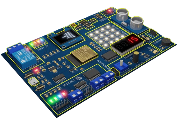 El proyecto del kit educativo consiste en una tarjeta de desarrollo que simplifica la creación de proyectos de electrónica, robótica e Internet de las cosas (IoT), al integrar más de quince funciones diferentes en un único dispositivo. Entre los periféricos que ofrece el kit se encuentran el control de LED (ya sean tradicionales o RGB), motores DC, motores paso a paso y servomotores, así como la capacidad de leer sensores de diferentes tipos como temperatura, luz, inclinación, proximidad y voltaje. Asimismo, incluye una bocina, display de 7 segmentos, pantalla OLED, pulsadores, receptor infrarrojo, relay y un pin libre para personalizar y extender las funcionalidades del proyecto.